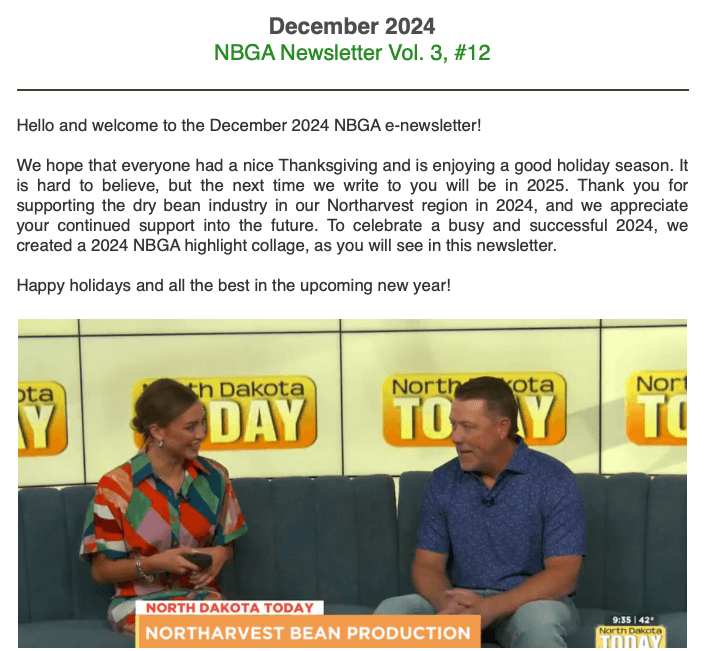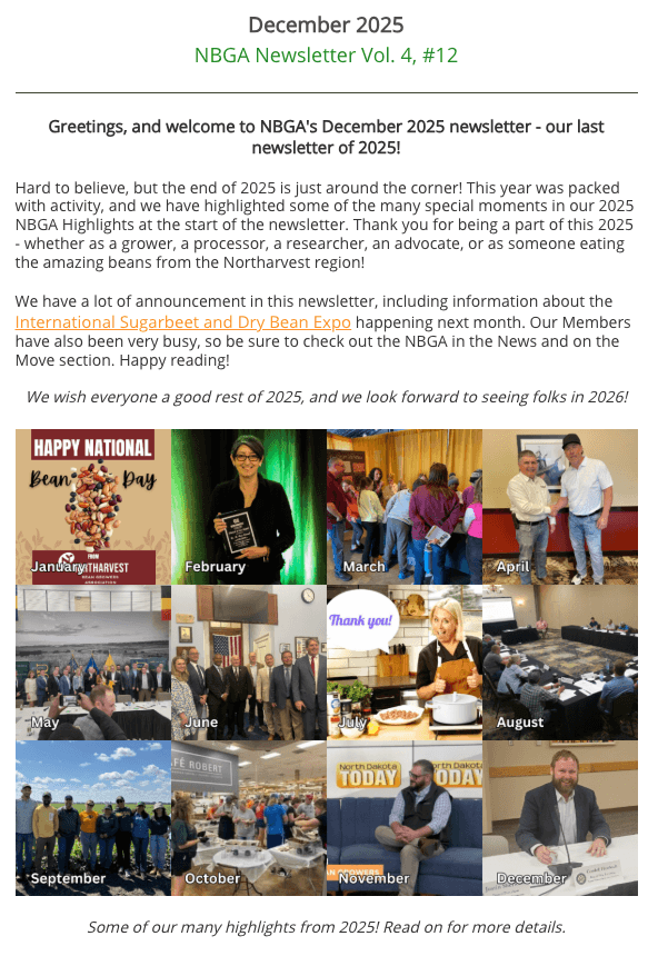 NBGA staff – along with contributing writer Chelsea Didinger from www.alegumeaday.com – produce a lengthy monthly newsletter covering the latest news, activity, and videos from NBGA as well as a round-up of news & happenings in the dry bean industry.